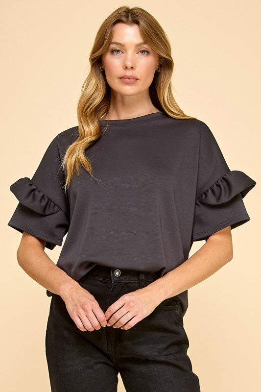 Solid Top with Double Ruffle Sleeve