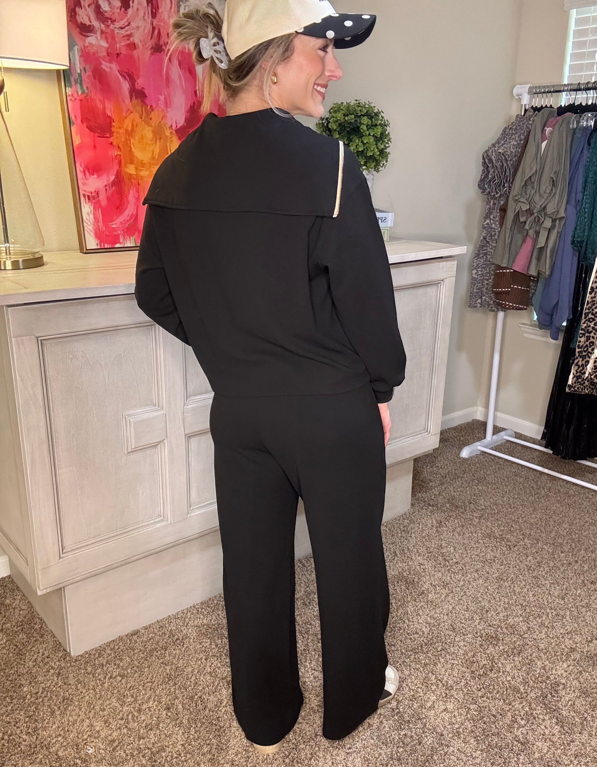 LONG SLEEVE HALF ZIP SAILOR COLLAR KNIT PULL OVER TOP AND DRAWSTRING PANT SET